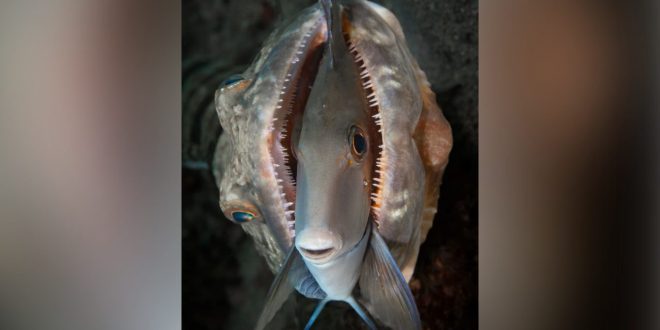 تُظهر الصورة، التي وثّقها جينسن في ولاية فلوريدا الأمريكية عام 2023، سمكة جَرّاح تبدو هادئة بشكلٍ مضحك رُغم تواجدها بين فكّي سمكة سحلية كانت تحاول التهامها.