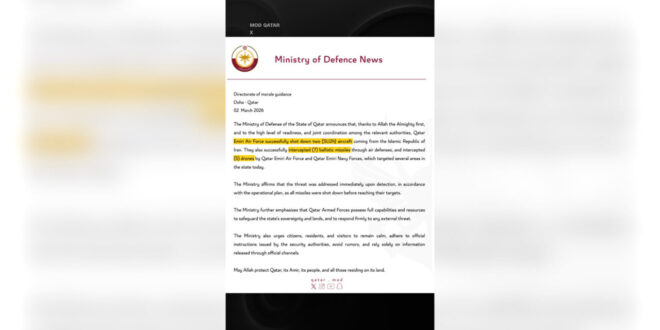 وفي بيان صادر عن وزارة الدفاع، أفادت قطر بأن "سلاحها الجوي الأميري أسقط طائرتين إيرانيتين من طراز (SU24) و5 طائرات مسيرة، بالإضافة إلى منظومات صواريخ الدفاع الجوي الإيرانية، واعترض 7 صواريخ باليستية داخل أراضيها".