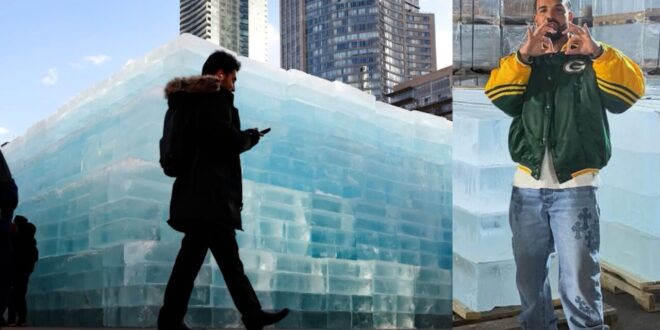 توافد معجبو دريك إلى منحوتة جليدية يبلغ ارتفاعها 25 قدمًا في تورنتو، بحثًا عن تاريخ إصدار ألبوم قال مغني الراب الكندي إنه مخفي داخل الجليد.