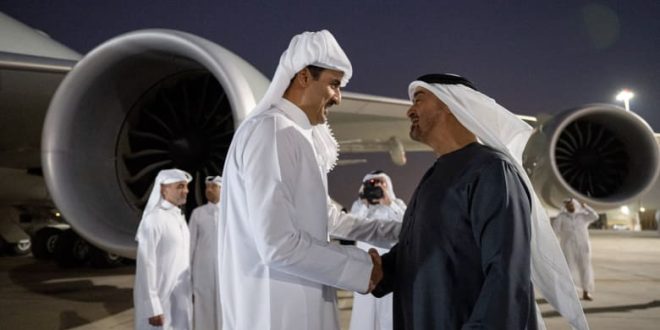 وحطت طائرة أمير قطر في مطار الرئاسة في العاصمة الإماراتية حيث كان الشيخ محمد بن زايد باستقباله، حسبما ذكرت “وام”.