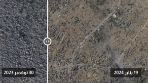 من الأعلى، كانت غ-زة خضراء ورمادية: مساحات واسعة من الحقول تتداخل مع المدن المكتظة بالسكان. والآن، تُظهر صور الأقمار الصناعية أرضًا معظمها بني اللون، وقد تم قصفها وتسويتها بالجرافات.